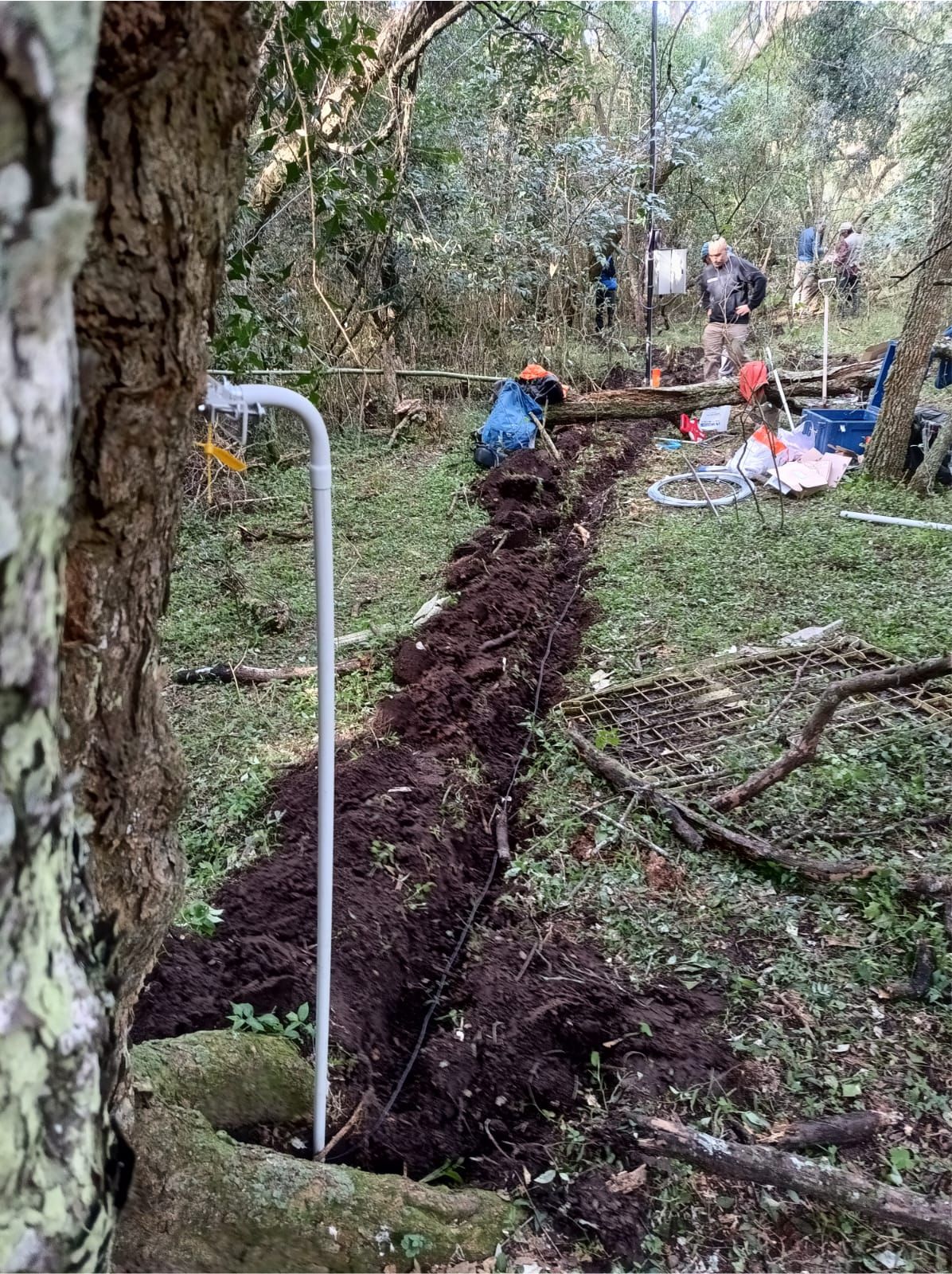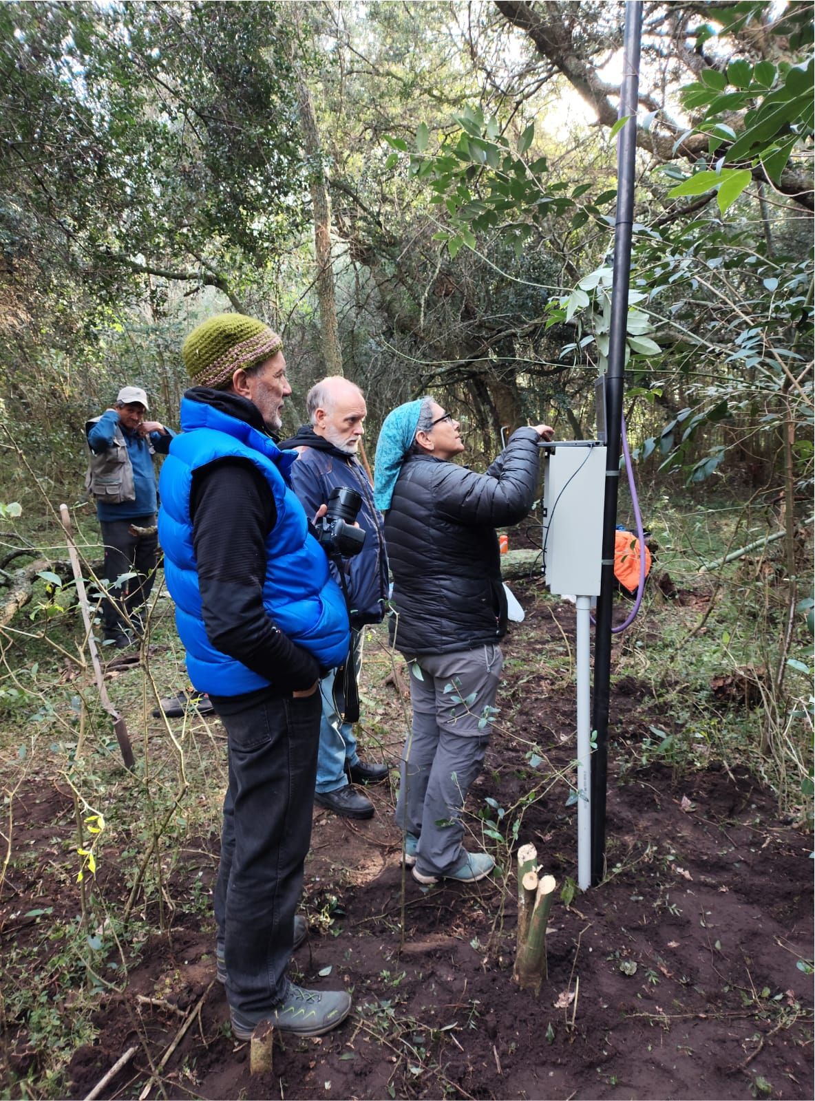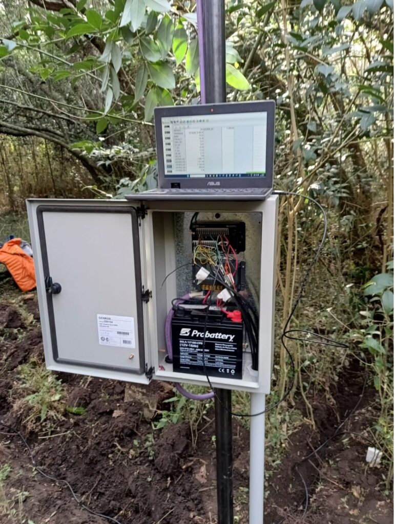Este nuevo sitio de monitoreo consiste en seis dendrómetros de punto Ecomatik conectados a seis árboles adultos de tala y centralizados a un datalogger Campbell CR300 que funciona en forma autónoma gracias a una batería de 12v alimentada por un panel solar. Además, se instaló un sensor de contenido volumétrico de agua y temperatura de suelo que también se conectó al datalogger.