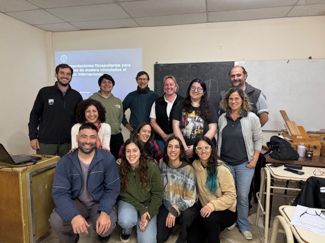 Durante el encuentro el ingeniero Grosso presentó los aspectos más importantes sobre la estructura organizacional del SENASA y sobre la Convención Internacional de Protección Fitosanitaria. A continuación, la Ingeniera Cirignoli profundizó sobre las Normas Internacionales para Medidas Fitosanitarias (NIMF), con especial referencia a la NIMF Nº15 que establece la reglamentación del embalaje de madera utilizado en el comercio internacional. En el marco de dicha norma se mencionaron algunos antecedentes que dieron lugar a su establecimiento, como así también las principales plagas cuarentenarias para nuestro país y el daño económico que ellas ocasionan. En este contexto, se comentaron las pautas contenidas en la NIMF Nº 15 para disminuir los riesgos fitosanitarios de las maderas utilizadas como embalajes y soporte y/o acomodación en el comercio internacional de mercaderías, como así también, los diferentes tratamientos de aplicación (térmico, bromuro de metilo, dieléctrico, entre otros), forma de implementación y certificación. Por último, la ingeniera Corrada hizo mención de los requisitos para la habilitación de establecimientos y las últimas implementaciones del área, las cuales comprenden el sistema de certificación digital, SIG TEM, y la incorporación de la Declaración Jurada para Productos de Origen Vegetal, DTVe, para embalajes de madera o madera de acomodación, comentando algunas experiencias durante sus inspecciones. Durante el encuentro se mostraron embalajes de madera que fueron inspeccionados en puerto con presencia de actividad biológica, maderas con los sellos requeridos en los embalajes a exportar y ejemplos de formularios requeridos en los procesos de certificación de tratamientos o envío de material. Asimismo, los disertantes comentaron sobre las diferentes áreas y posibilidades laborales para Ingenieros Forestales en el marco del SENASA.